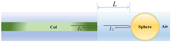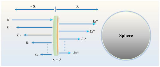 Here, represents the laser frequency, t denotes time, is the initial phase of the light, and is the optical field amplitude. The reflection coefficient of the collimator end face is denoted as , and its transmission coefficient is . The reflection coefficient of the metallic sphere is represented by . Figure 3 shows the optical transmission path in the designed low-finesse F–P cavity. The incident light is partially reflected at , resulting in a backward-propagating wave , and the forward-propagating light entering the cavity along the x-axis is denoted . These components are expressed as follows: