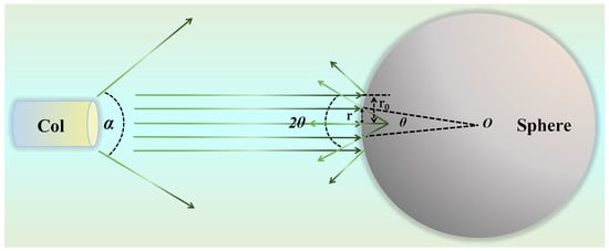 The reflection process of a sphere is illustrated in Figure 2. When a collimated parallel beam is incident on the spherical reflector, only the portion of the reflected light that falls within the system’s acceptance angle can be effectively collected and contribute to interference. Due to the curvature of the spherical surface, the reflected beam undergoes spatial divergence, causing a significant portion of the light to fall outside the collection range, thereby resulting in an effective reflectivity that is much lower than the actual surface reflectivity of the sphere. Geometric analysis shows that for a spherical surface with a divergence angle of , the reflected beam has a divergence angle of . Assuming the acceptance angle of the optical system is , only the portion of the light satisfying can be effectively received. Accordingly, the radius of the receivable light spot can be expressed as