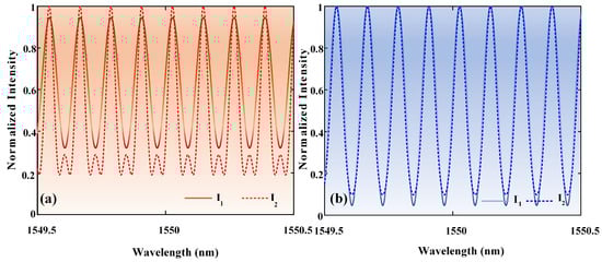 First, the interference characteristics of the spherical reflection in the F–P cavity were analyzed through theoretical modeling and numerical simulation. Figure 4 shows the simulated results for both the first- and second-order interference patterns. In this study, the incident light is set with an amplitude , an initial phase , and a cavity length mm. The reflectivity coefficient is set as , and the transmittance is . As shown in Figure 4a, when the reflectivity increases to 0.8, the spectral shape of the second-order interference intensity deviates significantly from a sinusoidal form owing to the overlapping of multiple reflected beams. By contrast, Figure 4b shows that when the reflectivity is reduced to 0.02 (corresponding to the spherical reflector used in this design), the spectral curves of the first- and second-order interference intensities and exhibit minimal differences and are almost identical.