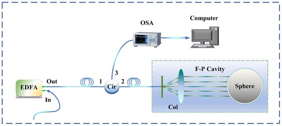 Experimental setup for feasibility verification of the low-finesse F–P cavity. EDFA: erbium-doped fiber amplifier; Cir: circulator; OSA: optical spectrum analyzer; Sphere: reflective sphere.