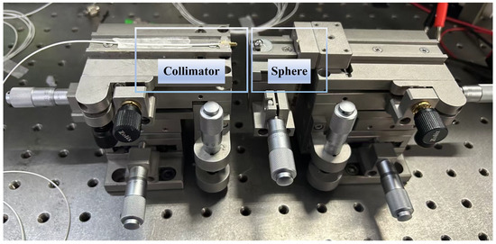 The experimental setup is shown in Figure 6. To enable precise optical alignment, the fiber collimator and reflective sphere are mounted on adjustment stages with six degrees of freedom. The optical alignment process is significantly simplified using a spherical surface as the reflector. The beam needs only to be roughly aligned with the center of the reflective sphere, without requiring precise angular adjustment of the reflective surface, thereby satisfying the design requirements of a low-finesse F–P cavity.