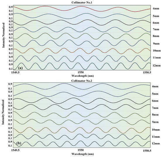 Normalized experimental results of low-finesse F–P cavity interference spectra at different working distances. Experimental results with (a) collimator no. 1 and (b) collimator no. 2.