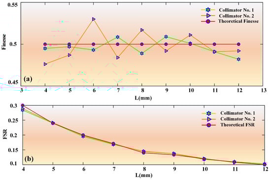 Under fixed reflective sphere diameters, the working distance between the spherical surface and collimator was varied. Five working distances (4, 5, 6, 7, 8, 9, 10, 11 and 12 mm) were selected for the experiment by adjusting the separation L between the sphere and collimator. Figure 7a and Figure 7b show the normalized interference spectra obtained using collimators 1 and 2, respectively. The experimental results indicate that as L increases, both the free spectral range (FSR) and 3 dB bandwidth exhibit a decreasing trend. This observation aligns with theoretical expectations, as the FSR is inversely proportional to the cavity length in an F–P interferometer. As L increases, the fringe spacing decreases, thereby decreasing both the FSR and bandwidth. Analyzing the interference spectra under each experimental condition can help obtain the corresponding FSR and finesse F, where the finesse is defined as the ratio of the FSR to the 3 dB bandwidth. Figure 8a shows the measured finesse values of the F–P cavities at different working distances. The average finesse values obtained from the interference spectra are 0.496 and 0.502 for Collimators 1 and 2, respectively. These results align with the theoretical design value of 0.5, confirming that the experimental implementation satisfies the design requirements for a low-finesse F–P cavity. Figure 8b illustrates the relationship between the FSR and cavity length, indicating that the FSR decreases with increasing cavity length. The experimental results are consistent with the theoretical calculations, further validating the accuracy and effectiveness of the low-finesse F–P cavity design. Summarily, the measured finesse values confirmed that the proposed design satisfied the performance requirements of a low-finesse F–P cavity. The interference spectra obtained using both types of collimators exhibited finesse values close to the ideal orthogonal interference value of 0.5. This result demonstrates that when the receiving angle and output beam radius of the fiber collimator are fixed, designing the diameter of the reflective sphere to satisfy the finesse requirement of the F–P cavity and achieve ideal orthogonal interference is sufficient.