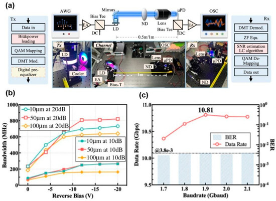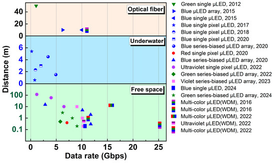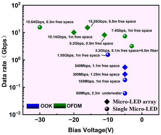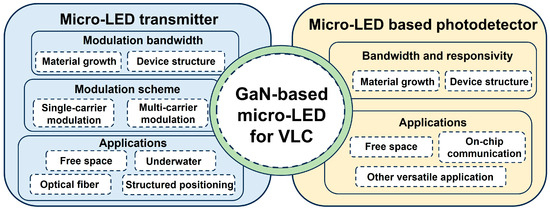 - The promotion of GaN-based high-bandwidth micro-LEDs will further enhance the development of VLC. The introduction of new substrates and the optimization of QWs will further shorten the carrier recombination lifetime and improve the modulation bandwidth of the micro-LED. The research on field-effect transistors, heterojunction memory devices, and perovskite solar cells can inform the bandwidth design of micro-LED through shared technological approaches such as band structure engineering, interface optimization, and multidimensional structural design [119,120,121]. For the design of devices, size, connection methods, and device structure are the main focuses of researchers. The future of the micro-LED needs to better balance the relationship between the modulation bandwidth and the optical power. High bandwidth combined with high optical power will further improve the data rate of VLC. In addition, the introduction of new fabrication processes will also improve the efficiency of micro-LED manufacturing. By simultaneously innovating in materials, structure, and manufacturing processes, it is possible to break through the limitations of bandwidth and optical power, achieving low-energy, high-speed communication performance to meet the increasing demand for data transmission.