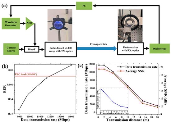 - Niu, W.; Shi, J.; Xu, Z.; Li, D.; Xiao, W.; Wang, G.; Zhang, J.; He, Z.; Shen, C.; Chi, N. 8.205-Gbit/s visible light communication utilizing 4 × 4 Si-substrate μLED-based photodetector array. In Proceedings of the 2022 Optical Fiber Communications Conference and Exhibition (OFC), San Diego, CA, USA, 6–10 March 2022; IEEE: Piscataway, NJ, USA, 2022; pp. 1–3. [Google Scholar]