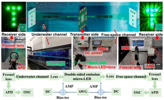 - Wang, P.; Chen, H.; Liu, X.; Yi, S.; Zhou, X.; Gu, E.; Huang, K.; Zheng, L.; Liu, R.; Cui, X. A GaN micro-LED based underwater wireless optical communication subjected to sea salt, Maalox and Chlorophyll. In Proceedings of the 2018 15th China International Forum on Solid State Lighting: International Forum on Wide Bandgap Semiconductors China (SSLChina: IFWS), Shenzhen, China, 23–25 October 2018; pp. 1–3. [Google Scholar]