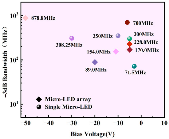- Li, Z.; Zhang, X.; Hao, Z.; Luo, Y.; Sun, C.; Xiong, B.; Han, Y.; Wang, J.; Li, H.; Gan, L. Bandwidth analysis of high-speed InGaN micro-LEDs by an equivalent circuit model. IEEE Electron Device Lett. 2023, 44, 785–788. [Google Scholar] [CrossRef]