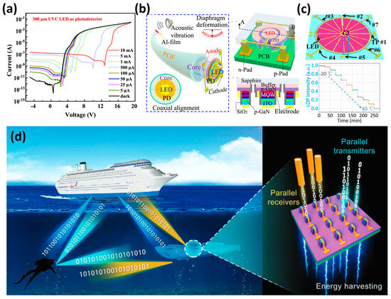 - Shan, X.; Zhu, S.; Qiu, P.; Qian, Z.; Lin, R.; Wang, Z.; Cui, X.; Liu, R.; Tian, P. Multifunctional ultraviolet-C micro-LED with monolithically integrated photodetector for optical wireless communication. J. Light. Technol. 2021, 40, 490–498. [Google Scholar] [CrossRef]