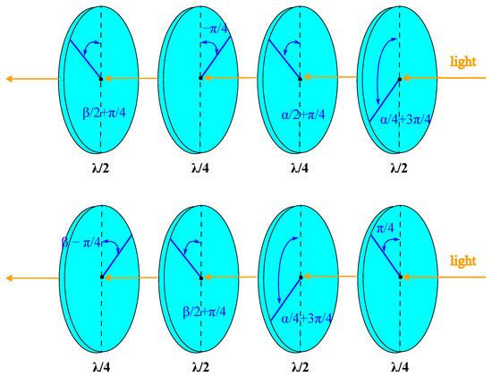 Figure 1 provides a schematic illustration of the polarization controllers corresponding to Equation (13b,c), implemented using two half-wave plates and two quarter-wave plates.