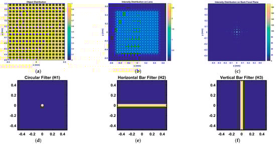 (4) Filter Design (Figure 1d–f): H1 (Low-pass filter, Figure 1d) blocks high-frequency components, resulting in image blurring and reduced contrast. This validates that high-frequency information determines image detail. H2 (Horizontal band-pass, Figure 1e) and H3 (Vertical band-pass, Figure 1f) act as directional filters, selectively transmitting spectral components in a single direction (y-direction for H2, x-direction for H3). This causes the image to retain only vertical or horizontal stripes, respectively, confirming that the image structure is synthesized by the spectral components passing through the filter. Contrast comparison: The unfiltered case has the highest contrast. H1 filtering yields the lowest contrast due to high-frequency loss. H2/H3 filtering maintains high contrast due to directional selectivity.
