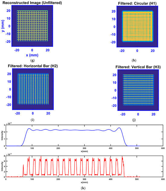 - H2-filtered (Figure 1i, Horizontal band-pass): Retains only vertical stripes (1D grating). Transmission of y-direction spectral components. Ripples appear at the top due to the inability of the physical filter to perfectly isolate high frequencies and boundary effects from discrete sampling in the simulation.