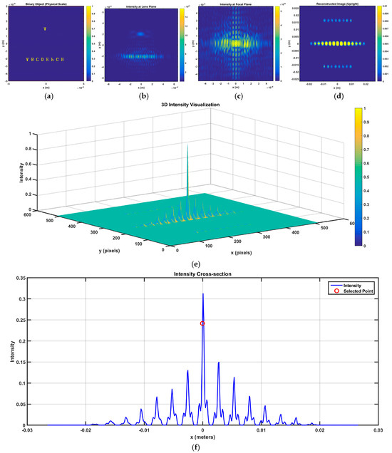 - Intensity distribution at the focal plane (spectrum plane) (Figure 3c): Central bright spot: Zero-frequency DC component; Symmetrical side lobes: Interference fringes from target/reference images; Modulated fringes: Phase modulation caused by spatial position differences among the targets.