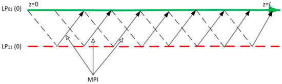 In G.654E SMFs, the coupling of optical power between the fundamental mode (LP01) and the high-order mode (LP11) originates in scattering events from fiber non-uniformities, from fiber microbending losses or from splices. A small fraction of the signal propagating in the LP01 mode is coupled into the LP11 mode and, after traveling some distance, is scattered back to the fundamental mode as indicated in Figure 1 [14]. Therefore, many replicas of the signal co-propagated with the signal itself appear in the fundamental mode.