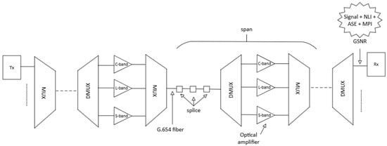 Figure 2 depicts an optical transmission system with several identical spans, where each span is composed of a section of G.654E SMF with several splices and an optical amplifier stage composed of a band demultiplexer, an amplifier for each one of the bands—C, L, and S—and a band multiplexer. This MB C+L+S transmission system has several optical channels characterized by their bandwidths and central wavelengths, which can transport optical signals with a certain baud rate and modulation format. In such a scenario, the transmitted signal is impacted by the amplified spontaneous emission (ASE) noise originated from the optical amplifiers, by the non-linear interference (NLI) noise from the optical fiber transmission and by the MPI noise from the mode coupling in the G.654E SMF, so the GSNR of channel i after transmission along several identical spans can be given by [22]
