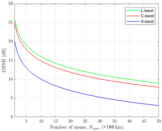 In Figure 6, the GSNR is represented as a function of the number of spans for the three studied bands. It can be observed that, as expected, the GSNR for all three bands decreases with the number of spans, which is in accordance with the behavior found in [30]. Also, the L-band has a superior GSNR in comparison with the C- and S-bands, mainly due to the ISRS power transfer [5]. The C- and the S-bands have a GSNR with, respectively, less than 1.1 dB and 5.7 dB in comparison with the L-band’s GSNR. In [5], similar results are obtained for a single span.