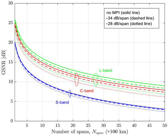 Figure 7 represents the GSNR for the three studied bands as a function of the number of spans for three MPI scenarios—no MPI, −34 dB/span, and −28 dB/span—for a typical splice loss of, respectively, 0.034 dB and 0.068 dB [14]. A 1 dBm optical launch power was used so that the GSNR is maximized, as shown in the previous section. As can be seen in Figure 7, without MPI, the L-band has a greater reach than the C- and S-bands, as already pointed out, whereas when the MPI is considered, this trend continues. It can also be observed that the transmission reach in the S-band decreases when MPI is considered. For a 2000 km link (20 spans), the S-band suffers a 0.2 dB GSNR penalty for a −34 dB/span MPI, and for a more restrictive MPI per span, e.g., −28 dB/span, a 0.7 dB penalty is achieved. If the L-band suffered from the MPI impact, a larger GSNR penalty would be obtained, respectively, 0.7 dB and 2.2 dB for −34 dB/span and −28 dB/span, as observed in Figure 7.