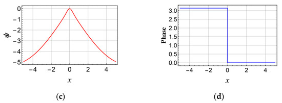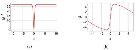 By applying Euler’s formula , the real and imaginary parts of Equation (20) are obtained. Figure 1 shows the waveform plots of the dark soliton solution of Equation (21) with appropriate coefficients under static conditions t = 0, while Figure 2 shows the corresponding contour plots.