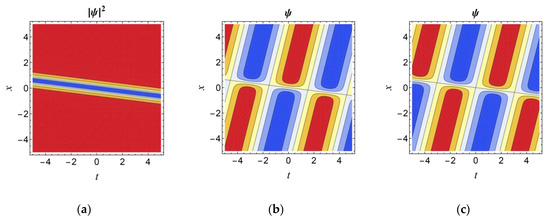 Contour plots of dark soliton for (1+1)D RNLSE incorporating 3OD and 4OD dispersions with Kerr nonlinearity with the parameters , , , , , and under time diffusion for (a) modulus, (b) real part, and (c) imaginary part.