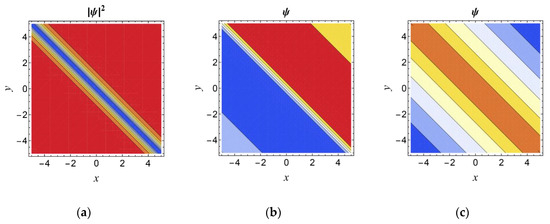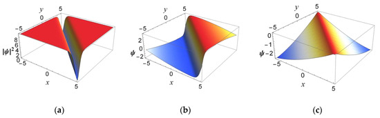 Contour plots of dark soliton for (2+1)D RNLSE incorporating 3OD and 4OD dispersions with Kerr nonlinearity with the parameters , , , , , , , and when for (a) modulus, (b) real part, and (c) imaginary part.