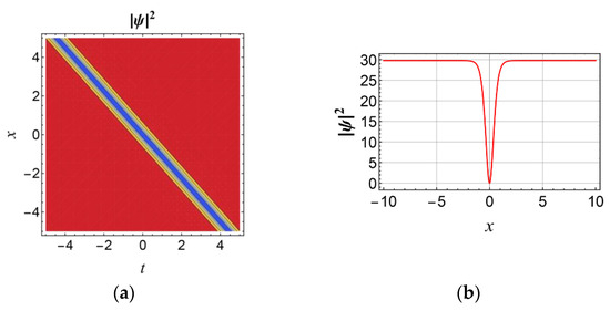 where . The detailed derivation process of Equation (27) is given in Appendix A. Figure 5 presents the dark soliton solution from Equation (27) under static conditions and appropriate coefficients, along with its contour plot under time diffusion. Moreover, by comparing the two (1+1)D models, which are the Equation (27) with PTs and Equation (21) without PTs, the amplitude coefficient C in Equation (27) explicitly depends on the inter-modal dispersion δ and self-steepening coefficient λ of PTs. In Equation (27), the term in the denominator in C replaces β in Equation (21), indicating that the self-steepening coefficient λ directly counteracts the Kerr nonlinearity β. On the other hand, the term before the variable t in Equation (27) gains an additional term δ compared with the Equation (21). This signifies that inter-modal dispersion δ directly alters the soliton propagation speed, independent of the dispersion coefficients α1, α2. This can also be clearly seen from the comparison of Figure 2a and Figure 5a; the deviation of the dark soliton in the x-direction is different within the same time range.