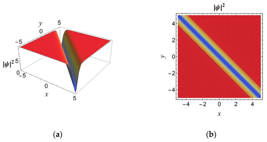 Figure 6 shows the dark soliton solution of Equation (28) under appropriate coefficients when t = 0. Combined with the comparison of the two (2+1)D models, which are Equation (28) with PTs and Equation (25) without PTs, this shows that, similar to the (1+1)D case, the amplitude coefficient D in Equation (25) incorporates PTs δ and λ. Moreover, the Kerr nonlinearity coefficient β is replaced by β+λk1 in the denominator of Equation (28). This shows that the self-steepening coefficient λ interacts with the wave number k1, modifying the effective nonlinearity governing the soliton’s amplitude. Additionally, the soliton propagation speed component gains an additive term δ. This inter-modal dispersion term δ directly increases the overall propagation speed in the (x+p2/p1y) direction, independent of the dispersion coefficients and wave numbers.