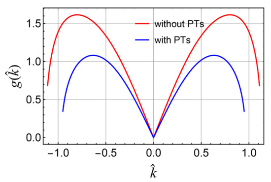 Figure 7 shows the MI gain spectrum of the RNLSE with and without PTs. It can be seen that the shapes of the gain spectra are similar for the two cases. This is because, based on Equation (40), the product of the high power of and the dispersion coefficient or , like , terms, dominate at large . It is suspected that these terms contribute to stabilizing the high-frequency perturbations so that the MI gain is small for the large absolute value of . Moreover, the peak of the MI gain spectrum for the RNLSE with PTs is lower than that without PTs, as shown in Figure 7. As shown in Equation (40), compared with the model without PTs, the value of can be reduced depending on the different values of parameters δ, λ, μ, which will compress the unstable regions and lead to a decrease in the peak gain. Qualitatively, the generation of MI mainly depends on a certain balance between nonlinear effects and dispersion effect [30]. If the perturbed parameter μ related to the high-order dispersion is a negative number, this means that the total dispersion of the model will be reduced. In this case, the peak gain will also decrease in order to reduce the nonlinear effect to make a new balance with the reduced dispersion.