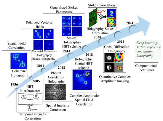 The integration of correlation techniques with laser speckle patterns and the adoption of holographic schemes unlocks unique opportunities by leveraging the speckle patterns’ inherent information-carrying properties across various applications. Over the past two decades, significant advancements have been made in speckle correlation methods, evolving from the foundational HBT intensity interferometer to diverse fields such as holography, microscopy, and polarimetry. Before delving into the development of SCH techniques, Figure 3 presents a timeline of key milestones in correlation holographic approaches utilizing the randomness of the speckle pattern. This overview highlights major research trends and summarizes critical progress in speckle correlation-assisted holography.