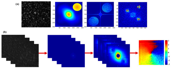 Experimental results. (a) speckle holography-assisted HBT-based intensity interferometer, (b) phase-shifting speckle holography-assisted HBT-based intensity interferometer. Modified with permission from [63,74].