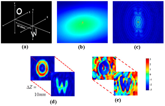Experimental results. (a) custom-designed object; (b) retrieved correlation hologram; (c) recovered in-line hologram behind the scattering layer; (d) recovered amplitude information at various planes behind the scattering medium; and (e) recovered phase information from various planes behind the scattering medium. Modified with permission from [67].