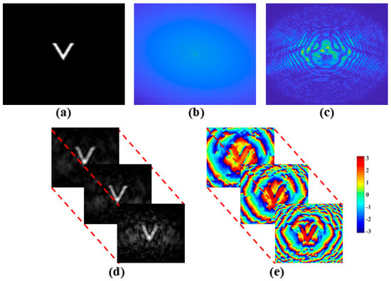 Experimental results. (a) custom-designed three-dimensional object; (b) retrieved correlation hologram; (c) recovered Fourier hologram behind the scattering layer; (d) recovered amplitude information from Fourier hologram; and (e) recovered phase information from the Fourier hologram. Modified with permission from [68].
