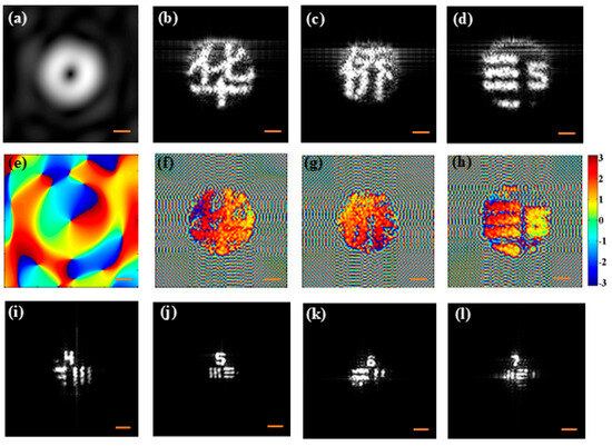 where , with and representing the phase map of the object and the carrier, respectively; is the inverse of tangent function; and is the Fourier transform of the ghost correlation holograms with . Figure 12 represents the experimental results of a phase-shifting-assisted HGD system, while Figure 12a–d represents the retrieved correlation holograms corresponding to the four phase-shifting conditions. Figure 12e represents the phase object (vortex phase pattern of topological charge 3) used for experimental demonstration purposes. The reconstructed phase information utilizing the phase-shifting procedure and the corresponding filtered phase information corresponding to a vortex with a topological charge of 3 are shown in Figure 12f and Figure 12e, respectively.