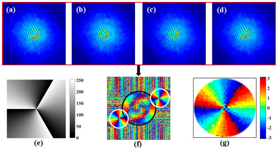 Experimental results. (a–d) retrieved correlation holograms corresponding to specific phase-shifting conditions; (e) phase pattern of vortex with a topological charge of 3 encoded in the spatial light modulator; (f) recovered phase distribution using phase-shifting procedure; and (g) filtered reconstructed phase distribution corresponding to vortex pattern with a topological charge of 3. Modified with permission from [71].