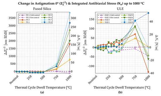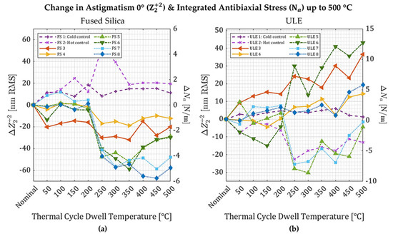 Thermal cycling to 500 °C changed the astigmatism 0° (and corresponding antibiaxial stress) in fused silica and ULE slightly (Figure 2). All the fused silica samples and some of the ULE samples exhibited relaxation (negative change in stress) starting after 200 °C. Only three out of the seven thermally cycled ULE samples exhibit relaxation (including the hot control), and the other four samples show an increase in stress. The deformations of the fused silica wafers correlate with the magnitude of induced deformation, but the deformations of the ULE wafers do not.