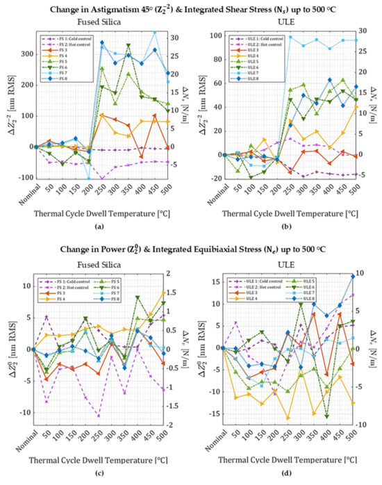 There is a marked increase in the astigmatism 45° deformation (and corresponding shear stress) for all figured samples after thermal cycling to 250 °C, and the amount it increases appears to correlate with the magnitude of induced antibiaxial stress (Figure 3a,b). This is unexpected since very little astigmatism 45° was imparted with ULSF. The power deformation (and corresponding equibiaxial stress) exhibits only very small changes in magnitude for both materials after thermal cycling to 500 °C (Figure 3c,d).