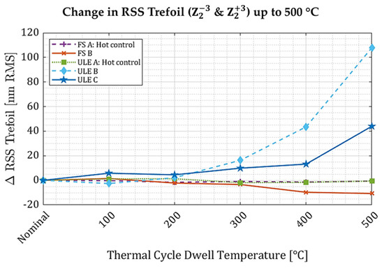 The 100 mm-diameter samples figured with trefoil 30° exhibited small changes in trefoil 30° over the course of the thermal cycling regimen (Figure 4). After 200 °C, all samples showed changes in stress, relative to the imparted stress (Table 1), that were consistent with measurement error (Table 2). After 500 °C, the changes are more significant, especially in ULE. In contrast to the 25.4 mm-diameter samples, the 100 mm-diameter figured fused silica and ULE wafers do not exhibit a shear-dominant mode between 200 and 500 °C, and the most significant change in surface figure is the change in magnitude of the figured term trefoil 30°.
