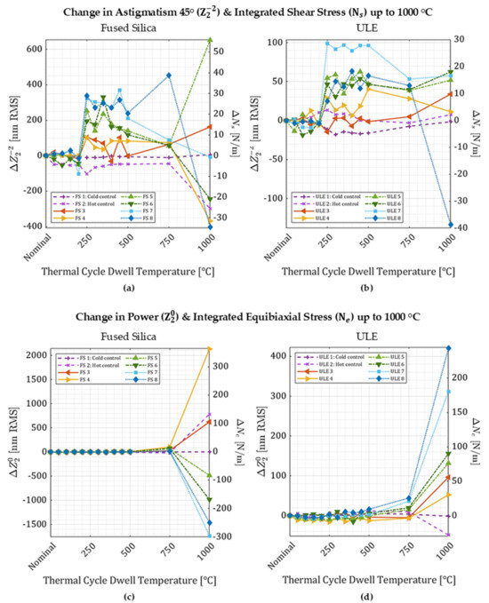 There are small changes in astigmatism 45° and large changes in power for most samples after 1000 °C. Astigmatism 45° and shear stress stabilize after 500 °C for ULE samples 2–7. The response from fused silica at elevated temperatures is variable; FS 3 and FS 5 show an increase in astigmatism 45° while the rest (including the hot control, FS 2) exhibit a decrease similar to ULE 8, and FS 7 returns to the nominal value. There is significant change in power and equibiaxial stress in all annealed samples (including the hot controls) after 1000 °C. The two fused silica samples with the lowest amounts of induced antibiaxial stress continue to increase after 1000 °C, but the samples figured with higher amounts decrease in power after 1000 °C. The change in equibiaxial stress in ULE is correlated with the ULSF-induced stress.