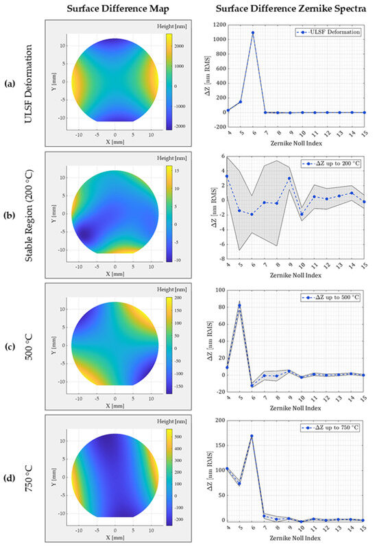 Surface maps (left) and Zernike spectra (right) of sample FS 4 from Experiment 1, from ULSF-induced deformation (a) through thermal cycling to 750 °C (b–d). The shaded regions in the Zernike spectra represent 2-sigma measurement repeatability.