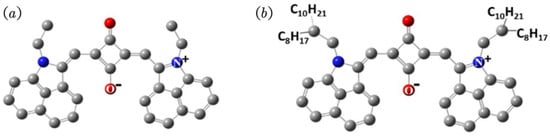 Owing to their distinctive structural and electronic characteristics, squaric acid dyes and their derivatives have attracted attention as promising materials for nonlinear optical applications [19,20]. These molecules, often exhibiting a D-A-D (donor–acceptor–donor) architecture, are characterized by extended π-conjugation, high photothermal stability, and strong absorption in the near-infrared and visible spectral regions [21,22,23]. The extended conjugation facilitates efficient delocalization of electrons, leading to enhanced nonlinear optical effects. Furthermore, the synthetic versatility of squaric acid dyes allows for precise tuning of their optical properties through structural modifications, enabling control over parameters such as the absorption wavelength, nonlinear optical coefficient, and response time [20,24,25,26]. This tunability makes them attractive building blocks for various photonic applications.