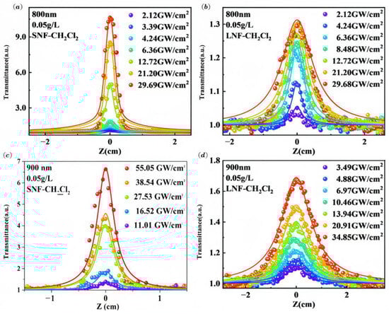 Open-aperture Z-scan results of SNF (a,c) and LNF (b,d) at 800 and 900 nm wavelengths in CH2Cl2 (c = 5 mg/L).