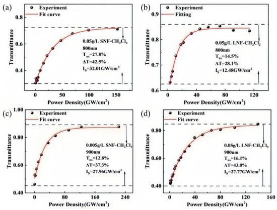 Based on the experimental results of the I-scans conducted at 800 nm and 900 nm, the dyes exhibit high transmittance under intense excitation, indicative of saturable absorption behavior. To quantitatively assess the performance of the saturable absorbing materials, key parameters such as saturation intensity, modulation depth, and nonsaturable loss are essential. Upon increasing the input energy density, the sample transmittance gradually rises, as shown in Figure 5. After reaching a certain intensity level, the transmittance stabilizes, characteristic of saturable absorption. To quantitatively evaluate the sample’s saturable absorption response, the Equation (2) was employed [32]: