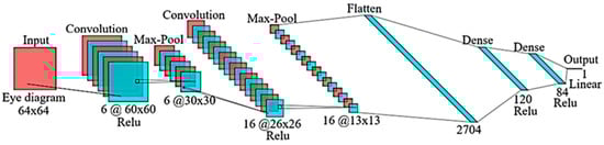 The model consists of nine layers: an input layer, two convolutional layers, two max-pooling layers, a flatten layer, two dense layers, and an output layer. Initially, the eye diagram is pre-processed and resized to 64 × 64 pixels before being passed to the input layer. The first convolutional layer applies 6 filters of size 5 × 5, while the second convolutional layer uses 16 filters, also of size 5 × 5. The Relu activation function is applied in both convolutional layers. Each convolutional layer is followed by a max-pooling layer with a pool size of 2 × 2, which reduces the spatial dimensions. After the second max-pooling operation, the output is flattened into a one-dimensional vector and passed through two fully connected dense layers. The first dense layer contains 120 neurons, and the second contains 84 neurons. Both layers employing Relu activation. Finally, the output layer consists of a single neuron with a linear activation function, which outputs either the BER or the Q-factor, depending on the specific prediction target.