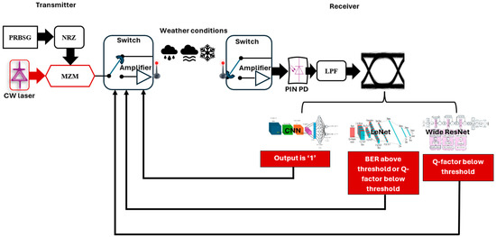 At the transmitter module, a 10 Gbps electrical signal is encoded on a bit stream produced by a Pseudo-Random Bit Sequence Generator (PRBSG) and modulated by an optical carrier generated from continuous wave (CW) laser operating at 1550 nm via a Mach-Zehnder Modulator (MZM), which facilitates high-speed modulation while preserving signal integrity and enabling reliable optical data transmission. Real-time feedback from the received eye diagram, a switching mechanism in the project, is employed to dynamically choose between transmission with or without optical amplification. A booster optical amplifier with a maximum gain of 25 dB is activated if any of the following conditions are met: the classified BER value is larger than , the BER predicted from the eye diagram using LeNet is larger than , or the Q-factor predicted from the eye diagram using either LeNet (for first dataset) or Wide ResNet (for the second dataset) is below the specified threshold. The amplification setup adopts a dual-stage configuration, comprising a pre-channel optical amplifier with a maximum gain of 25 dB and a post-channel amplifier offering up to 10 dB gain. This adaptive approach enhances transmission reliability by dynamically adjusting the gain in the system to accommodate the fluctuation of atmospheric conditions. Additionally, after the signal is transmitted using the selected amplifier configuration, the receiver monitors the actual BER of the received signal in real time. If this measured BER exceeds the predefined threshold, the system infers that the initial prediction may have been based on a suboptimal or corrupted eye diagram input. In such cases, the system can either request retransmission with an adjusted amplifier configuration or prompt the re-capture of the eye diagram for reanalysis. This feedback pathway ensures that the system adapts dynamically to unforeseen signal degradation and maintains the desired quality of service.