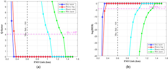 System performance over varying FSO link ranges under different atmospheric conditions. (a) Q-factor and (b) BER.