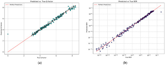 Predicted versus true values using the LeNet model. (a) The Q-factor and (b) BER.