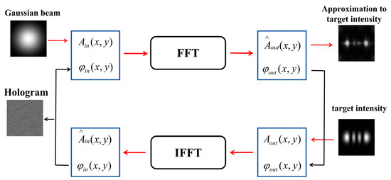 Figure 1 illustrates the framework diagram of the GS algorithm. Assume that we aim to generate the intensity distribution of the HG30 mode in the target plane. The incident beam is a Gaussian beam , and the initial input phase has a random distribution . After applying a Fast Fourier Transform (FFT), an approximate target intensity distribution , along with its corresponding phase distribution , is generated on the target plane. On the target plane, the generated approximate target intensity distribution is replaced with the standard intensity distribution of the HG30 mode , while the phase distribution remains unchanged. Subsequently, an Inverse Fast Fourier Transform (IFFT) is applied. During this process, the phase distribution is retained, while the generated intensity distribution is replaced with the incident Gaussian beam .