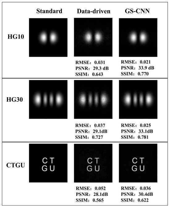 Next, we proceeded with a quantitative analysis. We compared the GS-CNN with the data-driven deep learning method [25] through experimental simulations. For both methods, we conducted simulations employing the aforementioned neural network architecture and parameters. Figure 5 shows the experimental results for the generated HG10 mode, the HG30 mode, and the abbreviation “CTGU” (representing our university). Taking the CTGU with a uniform light intensity distribution as an example, it illustrates that the GS-CNN can effectively generate arbitrary intensity distributions. To ensure a fair and objective evaluation of the mode quality generated by the two methods, we uniformly employed the same incident Gaussian beam, with a beam size set at 3 mm and a planar wavefront. The first column in Figure 5 displays the standard intensity distribution of the generated modes. The second column shows the intensity distribution of the modes generated through data-driven deep learning, while the third column presents the intensity distribution of the modes generated by the GS-CNN. We use the RMSE, peak signal-to-noise ratio (PSNR), and structural similarity index (SSIM) to evaluate the quality of the generated modes. As can be seen from Figure 5, compared with the HG10 mode, HG30 mode, and CTGU generated by the data-driven deep learning, the RMSE values of these three modes generated by the GS-CNN have improved by 0.01, 0.012, and 0.016, respectively. The PSNRs of these three modes generated by the GS-CNN have improved by 4.6 dB, 4.0 dB, and 2.3 dB, respectively. The SSIMs of these three modes generated by the GS-CNN have improved by 0.127, 0.054, and 0.057, respectively. From the results, it can be observed that as the spatial distribution of the generated mode becomes more complex, the quality of the mode generation gradually declines. The differences in the difficulty of generating different higher-order modes primarily stem from the combined influence of the mode complexity and neural network performance. Firstly, higher-order modes exhibit more complex spatial distributions and contain a greater number of nodes, necessitating more precise phase control. As illustrated in Figure 3, the hologram required for the HG30 mode is significantly more intricate than that for the HG10 mode. Moreover, complex structures are more susceptible to noise and systematic errors, leading to an increase in generation difficulty. Secondly, when dealing with complex distribution modes, neural network architectures encounter bottlenecks in feature extraction and generalization. The more complex the distribution of the mode, the stronger the multi-scale feature fusion capability required to capture both local details and global structures.