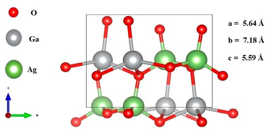 All first-principles calculations within the framework of density functional theory (DFT) were performed using the plane-wave pseudopotential approach as implemented in the VASP package [,]. The exchange-correlation interactions were treated with the generalized gradient approximation (GGA) in the form proposed by Perdew, Burke, and Ernzerhof (PBE) []. Equilibrium structural parameters, including lattice constants and atomic positions, were obtained by minimizing the total energy with the conjugate gradient algorithm. A kinetic energy cutoff of 550 eV was employed for the plane-wave basis set expansion, and k-point sampling grids were generated with the aid of the pre-processing tool VASPKIT []. The Gamma scheme was chosen for k-point mesh of 6 × 5 × 6. The relaxation of electronic degrees of freedom was terminated when the total energy and band structure energy changes between two electron steps were less than 10−6 eV. The convergence criterion for ionic steps was set to 0.01 eV Å−1. The calculated lattice parameters of β-AgGaO2 are a = 5.64 Å, b = 7.18 Å, and c = 5.59 Å as shown in Figure 1. The CIF file of the crystal structure is provided in the Supporting Information.