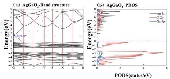 The optical and electronic characteristics of materials are fundamentally determined by their band structures. The band gap and density of states (DOS) for β-AgGaO2 are depicted in Figure 2.
