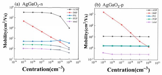 The findings demonstrate that, under moderate impurity concentrations, the electron mobility can achieve 100 cm2/V·s, while the hole mobility is 0.3 cm2/V·s. These values substantially exceed those of the intrinsic ferroelectric material BiFeO3, whose carrier mobility typically ranges from 1.6 to 1.8 cm2/V·s, with the electron mobility of β-AgGaO2 being particularly pronounced []. In BiFeO3, significant enhancement in electron mobility generally necessitates doping with ions such as La, which can increase electron mobility up to 80 cm2/V·s [,]. The mobility of charge carriers in semiconductors is influenced by various scattering mechanisms, primarily including ionized impurity (IPM), polar optical phonon (POP), piezoelectric (PIE), and acoustic deformation potential scattering (ADP), as shown in Figure 3. Consistent with other polar semiconductors, the carrier mobility in β-AgGaO2 is predominantly governed by polar optical phonon scattering []. The relatively low hole mobility in β-AgGaO2 is primarily attributed to strong scattering effects from polar optical phonons and piezoelectric interactions. This limited mobility significantly influences device performance and suggests the need for further optimization through material engineering or interface modification.