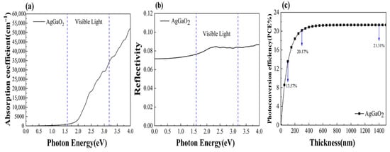 The calculated absorption coefficient α and reflectance R are depicted in Figure 4a and Figure 4b, respectively. The photoelectric conversion efficiencies, as shown in Figure 4c, reach 13% and 20% for film thicknesses of 100 nm and 300 nm, respectively, with the system approaching absorption saturation (21%) at 300 nm. In our device simulation, the thickness of β-AgGaO2 is chosen as 300 nm, a value that is commonly used for BiFeO3 thin films in experiments [,,]. The physical model described in Equation (11) calculates the theoretical maximum photovoltaic conversion efficiency, which serves as an initial reference for evaluating the photovoltaic potential of the material. To obtain a more accurate representation of the actual device performance, we construct a detailed solar cell device model in the following sections for further calculation of the solar cell characteristics of β-AgGaO2.